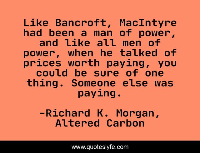 This page presents the quote "Like Bancroft, MacIntyre had been a man of power, and like all men of power, when he talked of prices worth paying, you could be sure of one thing. Someone else was paying.". Author of this quote is Richard K. Morgan, Altered Carbon. .