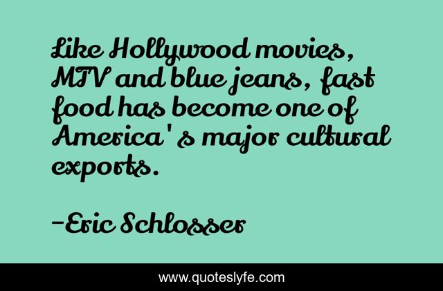 This page presents the quote "Like Hollywood movies, MTV and blue jeans, fast food has become one of America's major cultural exports.". Author of this quote is Eric Schlosser. This quote is about food, blue, america,.