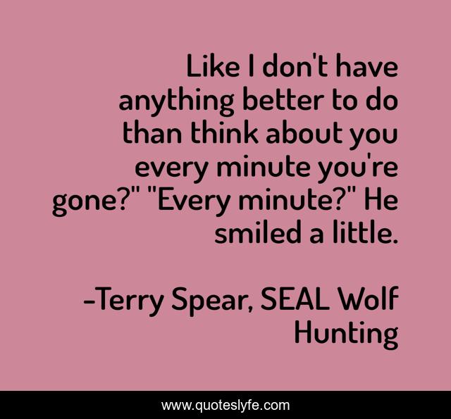 This page presents the quote "Like I don't have anything better to do than think about you every minute you're gone?" "Every minute?" He smiled a little.". Author of this quote is Terry Spear, SEAL Wolf Hunting. This quote is about military, wolves, paranormal-romance,.
