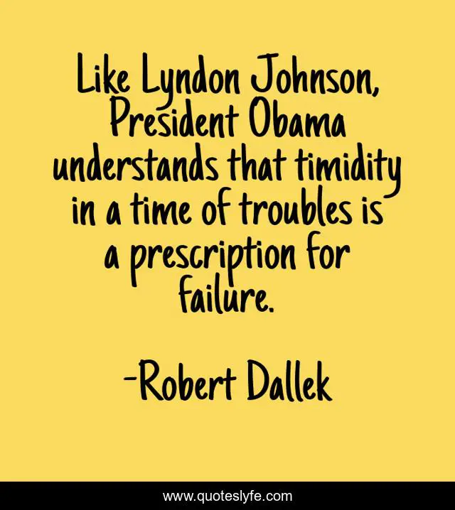 This page presents the quote "Like Lyndon Johnson, President Obama understands that timidity in a time of troubles is a prescription for failure.". Author of this quote is Robert Dallek. This quote is about president, like, time,.