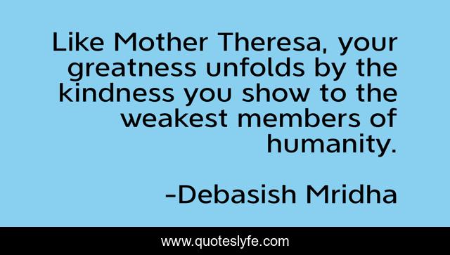 This page presents the quote "Like Mother Theresa, your greatness unfolds by the kindness you show to the weakest members of humanity.". Author of this quote is Debasish Mridha. This quote is about miraboli, mother-theresa, kindness, oscar-wilde, philosophy, debasish-mridha, quotes, debasish-mridha-md, inspirational,.