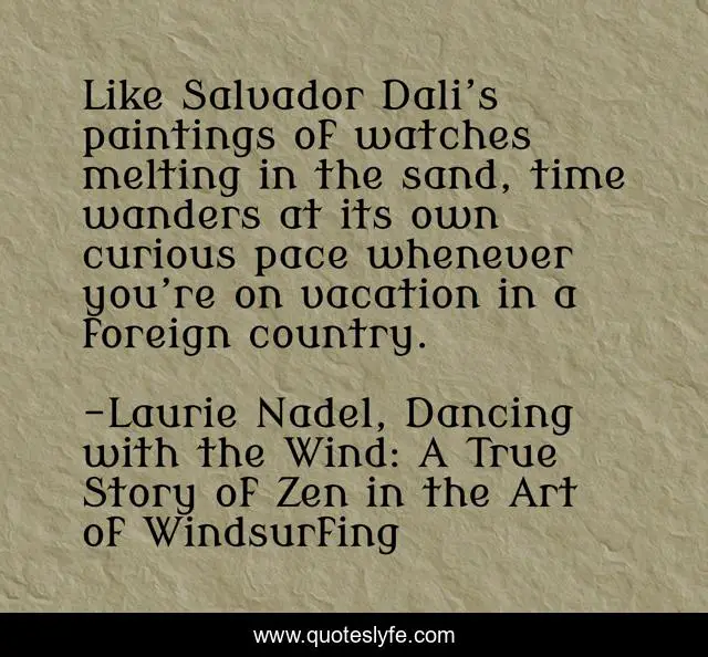 This page presents the quote "Like Salvador Dali’s paintings of watches melting in the sand, time wanders at its own curious pace whenever you’re on vacation in a foreign country.". Author of this quote is Laurie Nadel, Dancing with the Wind: A True Story of Zen in the Art of Windsurfing. This quote is about quote-of-the-day, salvador-dali, vacation, dan-rather, wayne-dyer, inspirational, quote-about-life, enthusiasm, quotes-twitter,.