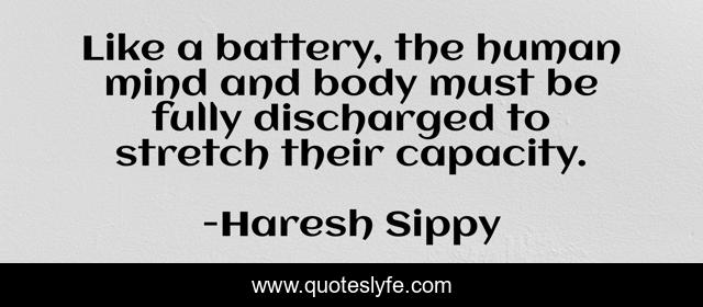 This page presents the quote "Like a battery, the human mind and body must be fully discharged to stretch their capacity.". Author of this quote is Haresh Sippy. This quote is about battery, mind, mind-power, capacity-building, body-and-mind,.