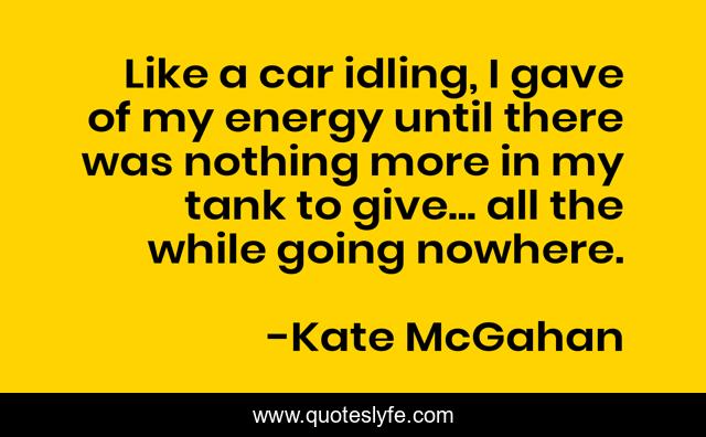 This page presents the quote "Like a car idling, I gave of my energy until there was nothing more in my tank to give... all the while going nowhere.". Author of this quote is Kate McGahan. This quote is about love, give, energy, share, empty, nowhere, immobile, affection,.