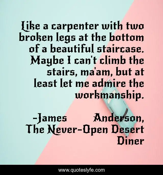This page presents the quote "Like a carpenter with two broken legs at the bottom of a beautiful staircase. Maybe I can't climb the stairs, ma'am, but at least let me admire the workmanship.". Author of this quote is James Anderson, The Never-Open Desert Diner. This quote is about relationships, beauty, carpentry,.