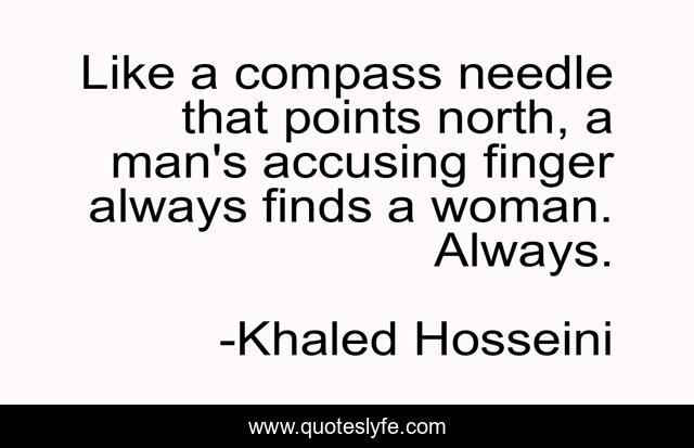 This page presents the quote "Like a compass needle that points north, a man's accusing finger always finds a woman. Always.". Author of this quote is Khaled Hosseini. This quote is about man, woman, men, women,.
