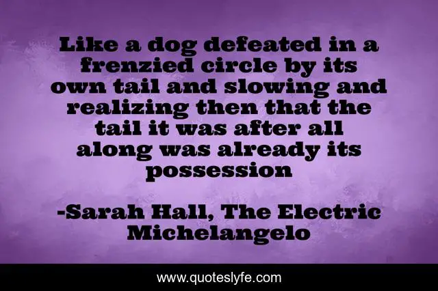 This page presents the quote "Like a dog defeated in a frenzied circle by its own tail and slowing and realizing then that the tail it was after all along was already its possession". Author of this quote is Sarah Hall, The Electric Michelangelo. .