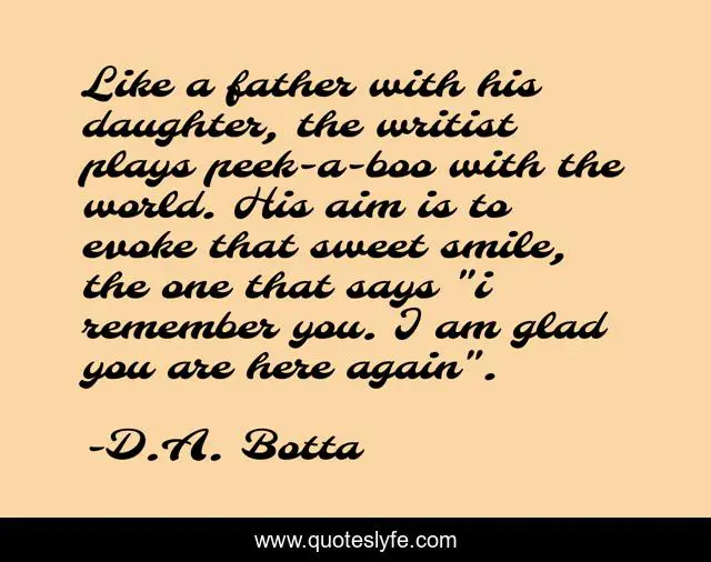 This page presents the quote "Like a father with his daughter, the writist plays peek-a-boo with the world. His aim is to evoke that sweet smile, the one that says "i remember you. I am glad you are here again".". Author of this quote is D.A. Botta. This quote is about writer, writist, author, success, writing,.