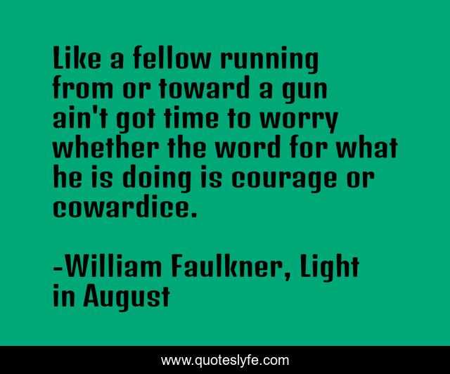 This page presents the quote "Like a fellow running from or toward a gun ain't got time to worry whether the word for what he is doing is courage or cowardice.". Author of this quote is William Faulkner, Light in August. This quote is about cowardice, courage,.