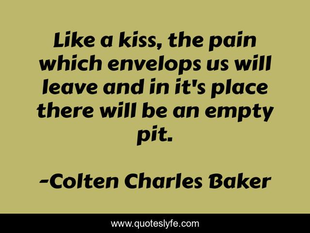 This page presents the quote "Like a kiss, the pain which envelops us will leave and in it's place there will be an empty pit.". Author of this quote is Colten Charles Baker. This quote is about love, pain, kiss, affection,.