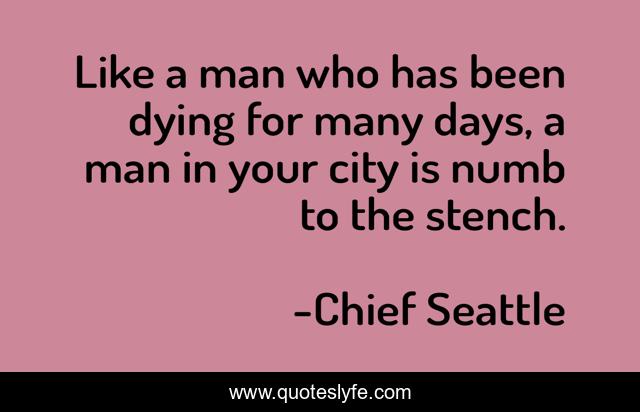 This page presents the quote "Like a man who has been dying for many days, a man in your city is numb to the stench.". Author of this quote is Chief Seattle. This quote is about city, cities, native-american, pollution,.