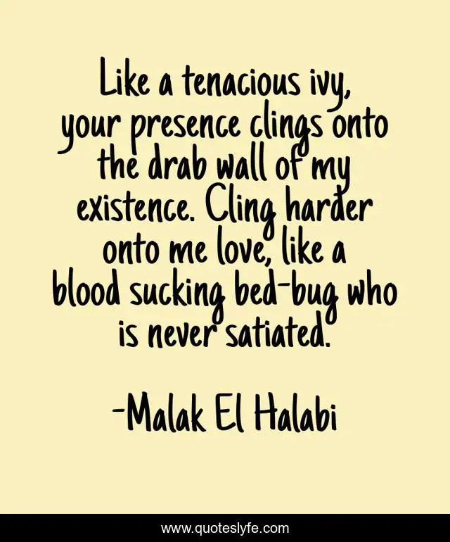 This page presents the quote "Like a tenacious ivy, your presence clings onto the drab wall of my existence. Cling harder onto me love, like a blood sucking bed-bug who is never satiated.". Author of this quote is Malak El Halabi. This quote is about desire, nature-of-love, passion,.