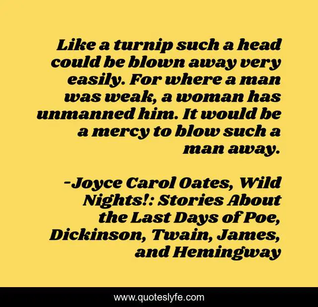 This page presents the quote "Like a turnip such a head could be blown away very easily. For where a man was weak, a woman has unmanned him. It would be a mercy to blow such a man away.". Author of this quote is Joyce Carol Oates, Wild Nights!: Stories About the Last Days of Poe, Dickinson, Twain, James, and Hemingway. .