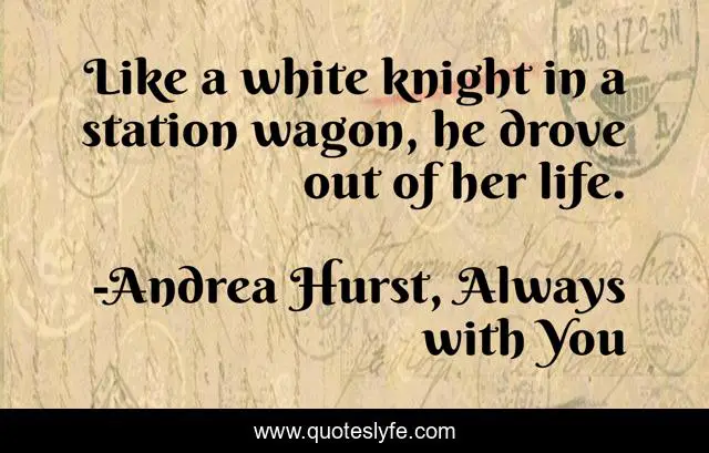 This page presents the quote "Like a white knight in a station wagon, he drove out of her life.". Author of this quote is Andrea Hurst, Always with You. This quote is about true-love, love, unrequited, soulmates, romance, starcrossed-love, love-lost, tragic-love, affection,.