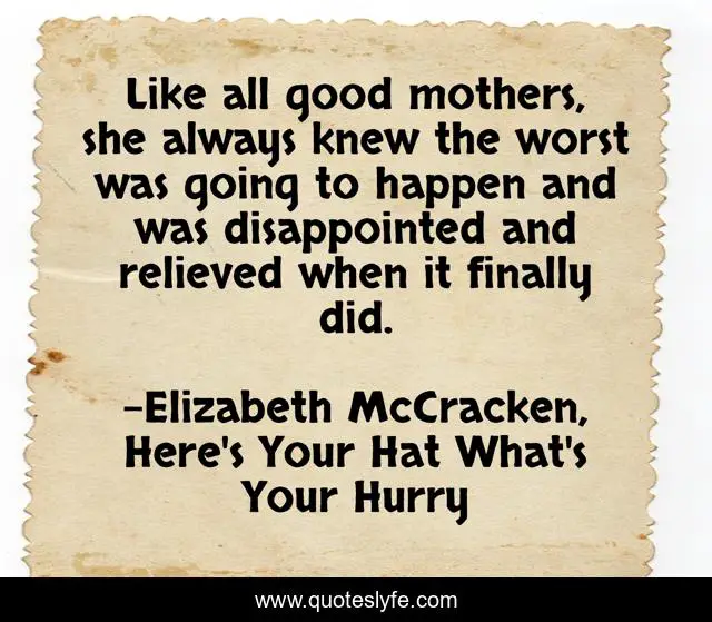 This page presents the quote "Like all good mothers, she always knew the worst was going to happen and was disappointed and relieved when it finally did.". Author of this quote is Elizabeth McCracken, Here's Your Hat What's Your Hurry. .