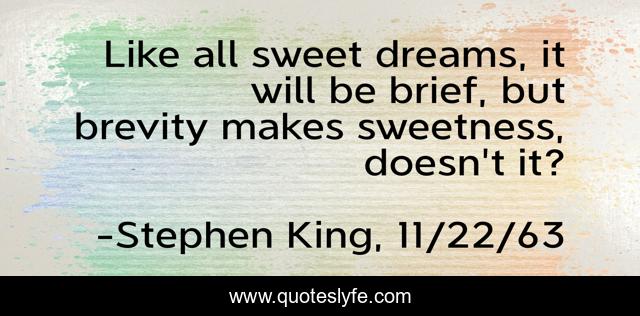 This page presents the quote "Like all sweet dreams, it will be brief, but brevity makes sweetness, doesn't it?". Author of this quote is Stephen King, 11/22/63. This quote is about sweet, brevity, brief, dreams,.