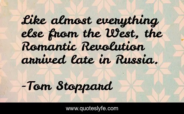 This page presents the quote "Like almost everything else from the West, the Romantic Revolution arrived late in Russia.". Author of this quote is Tom Stoppard. This quote is about late, everything, revolution,.