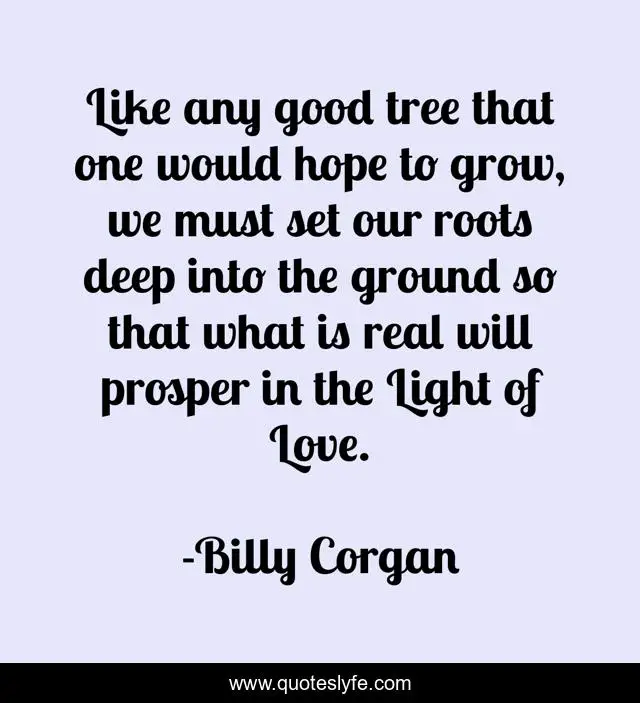 This page presents the quote "Like any good tree that one would hope to grow, we must set our roots deep into the ground so that what is real will prosper in the Light of Love.". Author of this quote is Billy Corgan. This quote is about light, good, love, affection,.