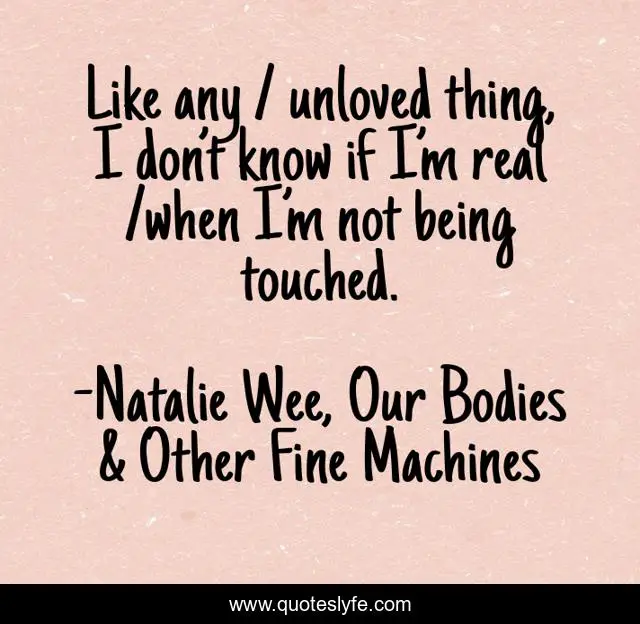 This page presents the quote "Like any / unloved thing, I don’t know if I’m real /when I’m not being touched.". Author of this quote is Natalie Wee, Our Bodies & Other Fine Machines. This quote is about longing, loneliness, love, lonely-people, affection,.