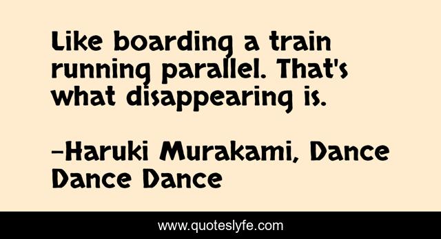 This page presents the quote "Like boarding a train running parallel. That's what disappearing is.". Author of this quote is Haruki Murakami, Dance Dance Dance. This quote is about communication, connection, love, parallel, affection,.