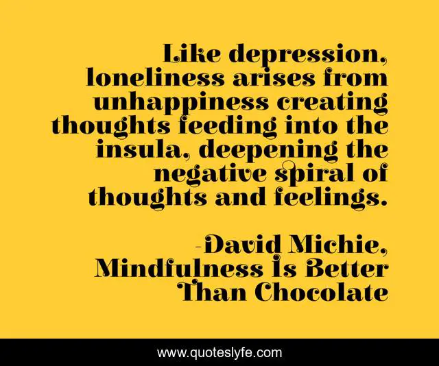 This page presents the quote "Like depression, loneliness arises from unhappiness creating thoughts feeding into the insula, deepening the negative spiral of thoughts and feelings.". Author of this quote is David Michie, Mindfulness Is Better Than Chocolate. This quote is about loneliness, depression,.