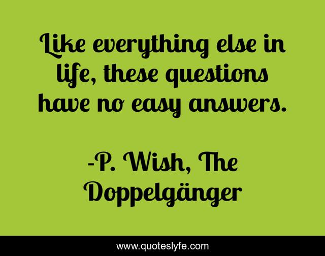 This page presents the quote "Like everything else in life, these questions have no easy answers.". Author of this quote is P. Wish, The Doppelgänger. This quote is about spiritual-growth, life, confusion, doubt, questions, answer,.