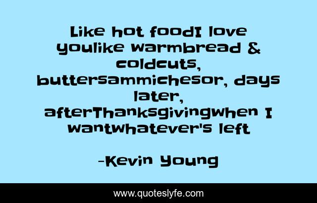 "Kevin Young Quotes." Quoteslyfe.com, 2025. Mon. 08 Dec. 2025. <https://www.quoteslyfe.com/quote/Like-hot-foodI-love-youlike-warmbread-coldcuts-240762>.