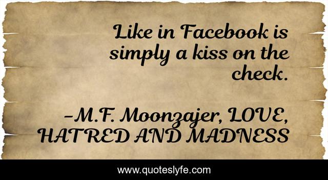This page presents the quote "Like in Facebook is simply a kiss on the check.". Author of this quote is M.F. Moonzajer, LOVE, HATRED AND MADNESS. This quote is about facebook, check, kiss, like,.
