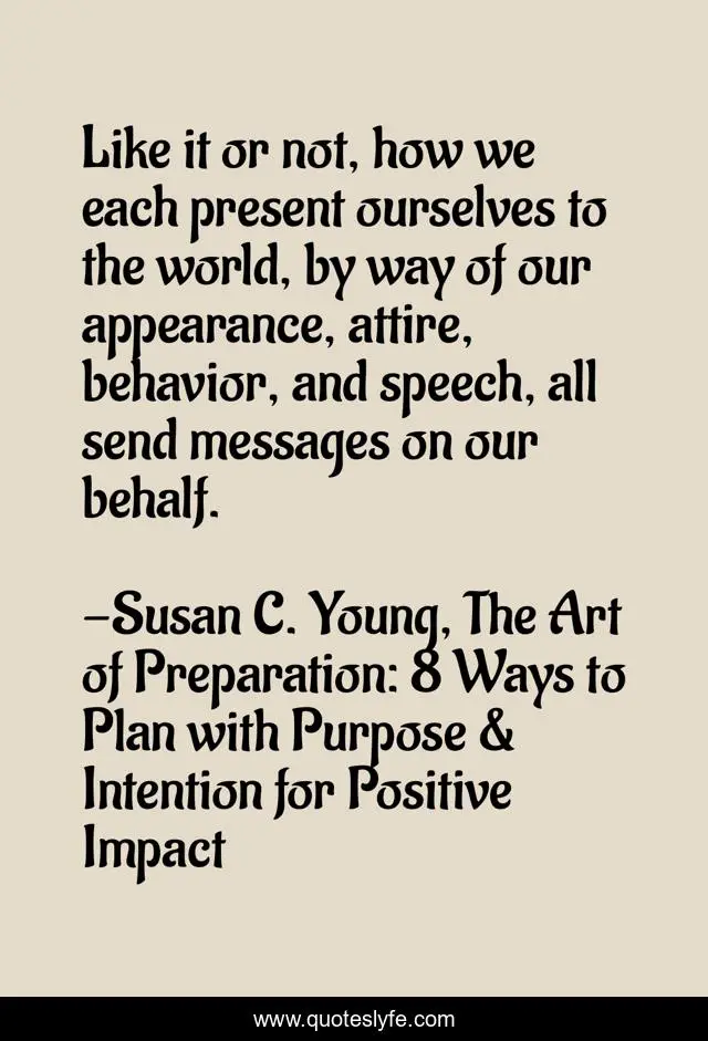 This page presents the quote "Like it or not, how we each present ourselves to the world, by way of our appearance, attire, behavior, and speech, all send messages on our behalf.". Author of this quote is Susan C. Young, The Art of Preparation: 8 Ways to Plan with Purpose & Intention for Positive Impact. This quote is about success, relationship, communication-skills, branding, attitude, behaviour, quotes-by-susan-c-young, dress-for-success, susan-young,.