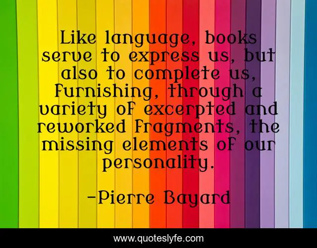 "Pierre Bayard Quotes." Quoteslyfe.com, 2025. Fri. 05 Dec. 2025. <https://www.quoteslyfe.com/quote/Like-language-books-serve-to-express-us-214675>.