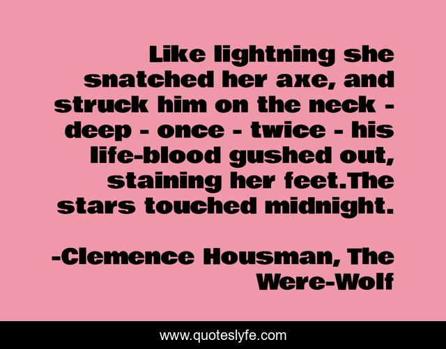 This page presents the quote "Like lightning she snatched her axe, and struck him on the neck - deep - once - twice - his life-blood gushed out, staining her feet.The stars touched midnight.". Author of this quote is Clemence Housman, The Were-Wolf. This quote is about midnight, stars, werewolf,.