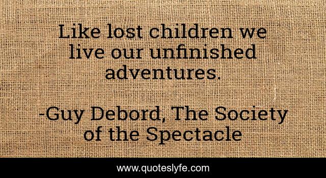 This page presents the quote "Like lost children we live our unfinished adventures.". Author of this quote is Guy Debord, The Society of the Spectacle. This quote is about life, adventure, children,.