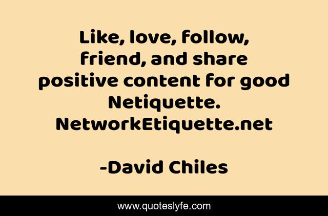 This page presents the quote "Like, love, follow, friend, and share positive content for good Netiquette. NetworkEtiquette.net". Author of this quote is David Chiles. This quote is about etiquette, social-media, social-network, social-networking, internet-etiquette, social, internet-rules, internet, internet-manners,.