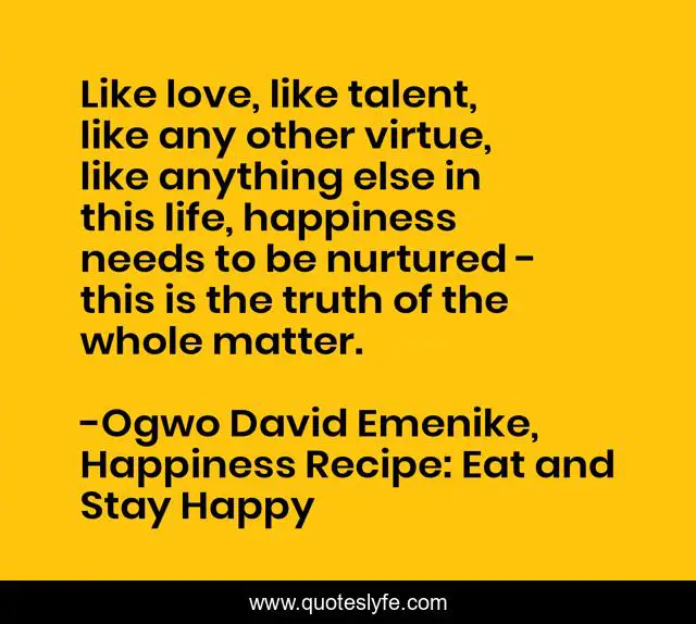 This page presents the quote "Like love, like talent, like any other virtue, like anything else in this life, happiness needs to be nurtured - this is the truth of the whole matter.". Author of this quote is Ogwo David Emenike, Happiness Recipe: Eat and Stay Happy. This quote is about confidence, talent, love, positive, motivational, optimistic, inspirational, enthusiasm, happiness,.