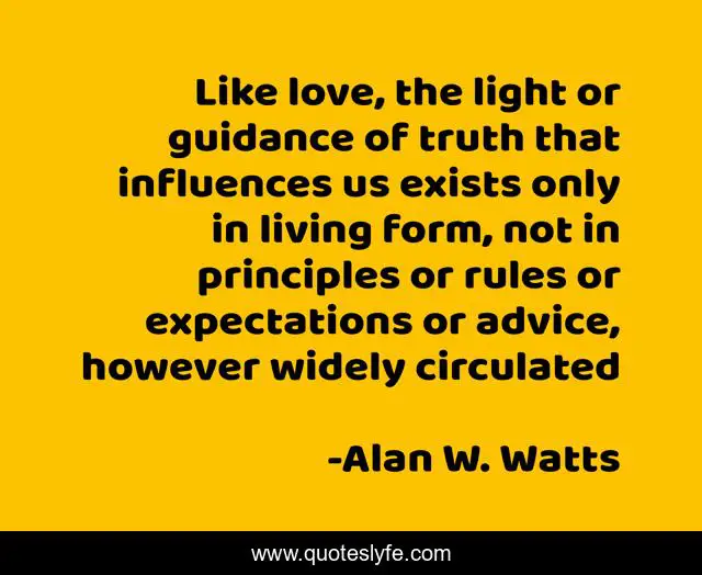 This page presents the quote "Like love, the light or guidance of truth that influences us exists only in living form, not in principles or rules or expectations or advice, however widely circulated". Author of this quote is Alan W. Watts. This quote is about truth, love, principles, affection,.