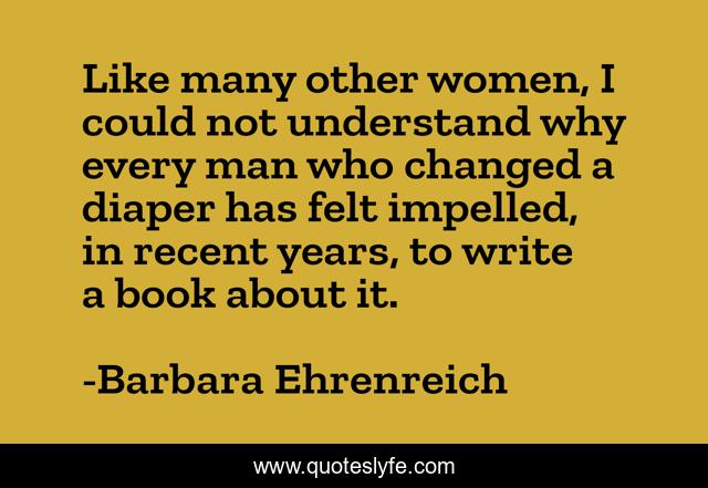 This page presents the quote "Like many other women, I could not understand why every man who changed a diaper has felt impelled, in recent years, to write a book about it.". Author of this quote is Barbara Ehrenreich. This quote is about book, why, man,.