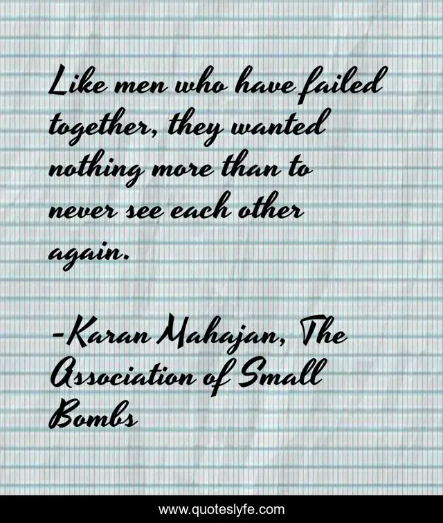This page presents the quote "Like men who have failed together, they wanted nothing more than to never see each other again.". Author of this quote is Karan Mahajan, The Association of Small Bombs. This quote is about failed-men, men,.