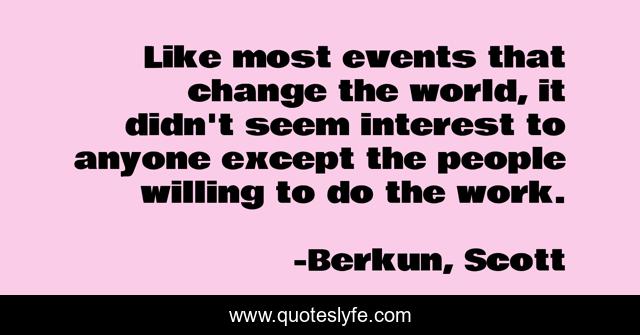 This page presents the quote "Like most events that change the world, it didn't seem interest to anyone except the people willing to do the work.". Author of this quote is Berkun, Scott. This quote is about change, hard-work, innovation,.