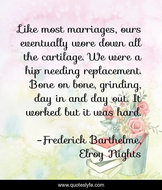 This page presents the quote "Like most marriages, ours eventually wore down all the cartilage. We were a hip needing replacement. Bone on bone, grinding, day in and day out. It worked but it was hard.". Author of this quote is Frederick Barthelme, Elroy Nights. This quote is about marriage, marriage-in-trouble,.