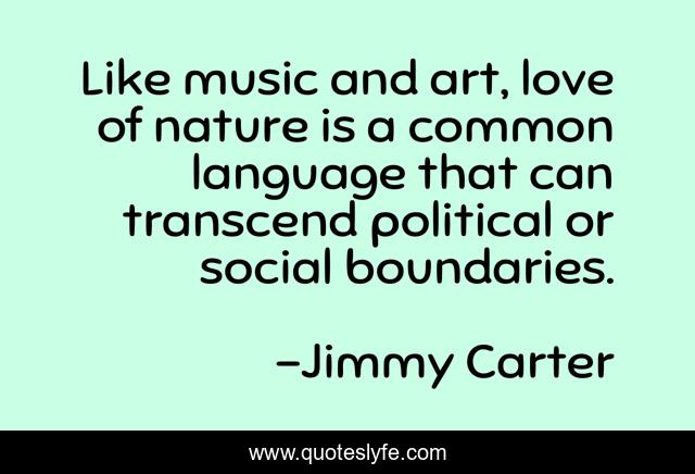 This page presents the quote "Like music and art, love of nature is a common language that can transcend political or social boundaries.". Author of this quote is Jimmy Carter. This quote is about environment, wilderness, nature,.