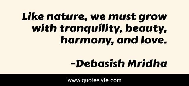 This page presents the quote "Like nature, we must grow with tranquility, beauty, harmony, and love.". Author of this quote is Debasish Mridha. This quote is about love, inspirational, beauty, nature, tranquility, philosophy, debasish-mridha, quotes, harmony,.