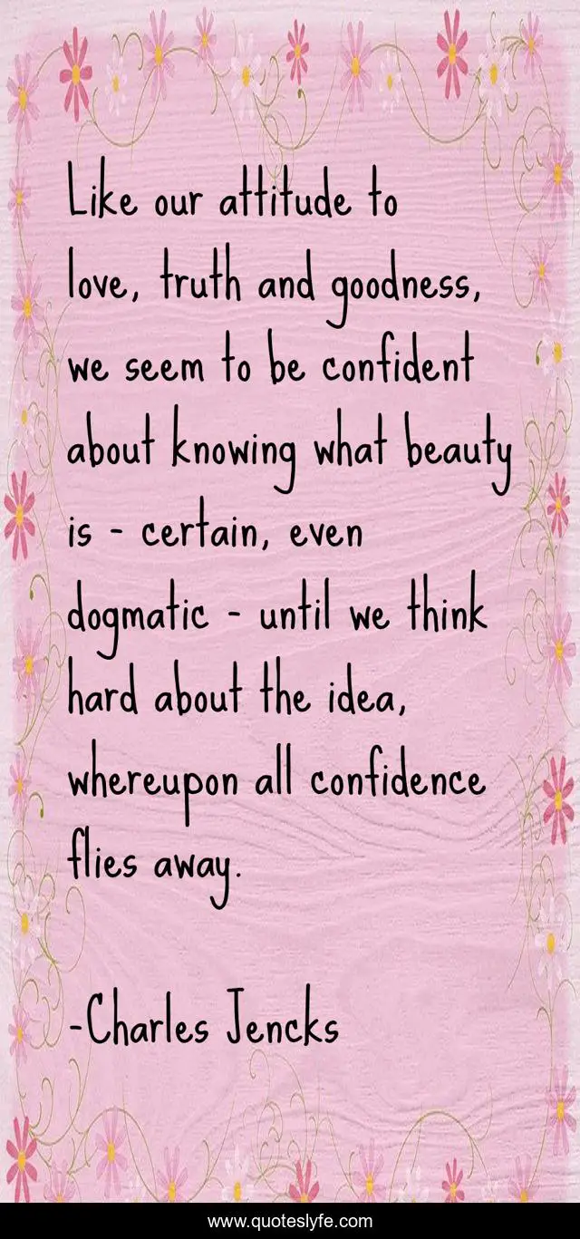 This page presents the quote "Like our attitude to love, truth and goodness, we seem to be confident about knowing what beauty is - certain, even dogmatic - until we think hard about the idea, whereupon all confidence flies away.". Author of this quote is Charles Jencks. This quote is about beauty, love, truth, affection,.