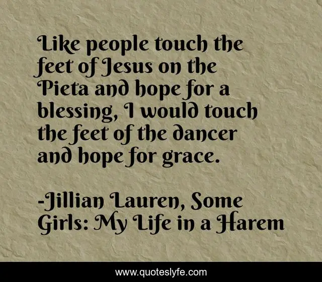 This page presents the quote "Like people touch the feet of Jesus on the Pieta and hope for a blessing, I would touch the feet of the dancer and hope for grace.". Author of this quote is Jillian Lauren, Some Girls: My Life in a Harem. .
