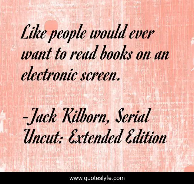 This page presents the quote "Like people would ever want to read books on an electronic screen.". Author of this quote is Jack Kilborn, Serial Uncut: Extended Edition. .