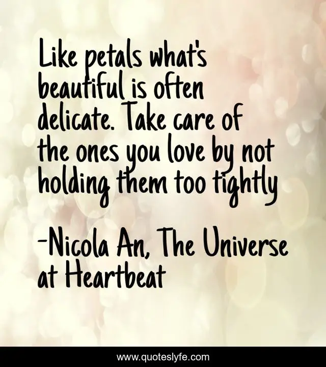 This page presents the quote "Like petals what's beautiful is often delicate. Take care of the ones you love by not holding them too tightly". Author of this quote is Nicola An, The Universe at Heartbeat. This quote is about relationships, true-love, love, people, loved-ones, relationship-advice, quotes-about-flowers, detachment, metaphors,.