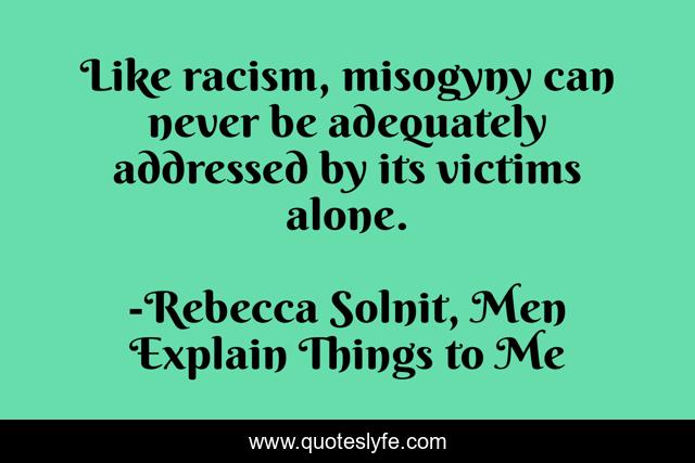 This page presents the quote "Like racism, misogyny can never be adequately addressed by its victims alone.". Author of this quote is Rebecca Solnit, Men Explain Things to Me. .