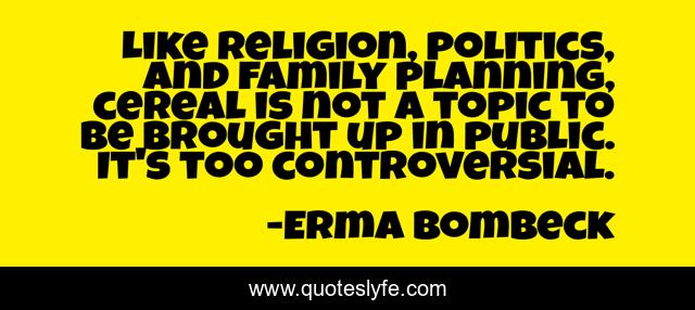 This page presents the quote "Like religion, politics, and family planning, cereal is not a topic to be brought up in public. It's too controversial.". Author of this quote is Erma Bombeck. This quote is about food, politics, religion,.