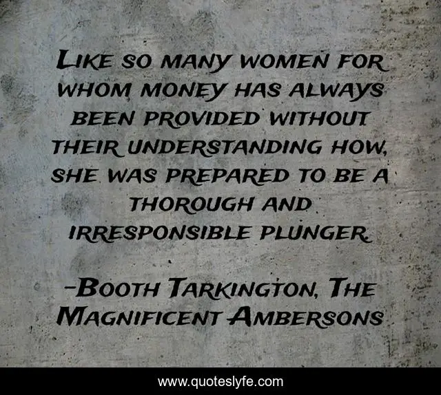 This page presents the quote "Like so many women for whom money has always been provided without their understanding how, she was prepared to be a thorough and irresponsible plunger.". Author of this quote is Booth Tarkington, The Magnificent Ambersons. This quote is about money, women,.