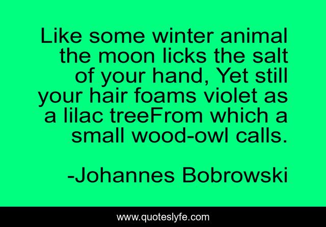 This page presents the quote "Like some winter animal the moon licks the salt of your hand, Yet still your hair foams violet as a lilac treeFrom which a small wood-owl calls.". Author of this quote is Johannes Bobrowski. This quote is about owl, winter, moon, hair, animal, violet, salt,.