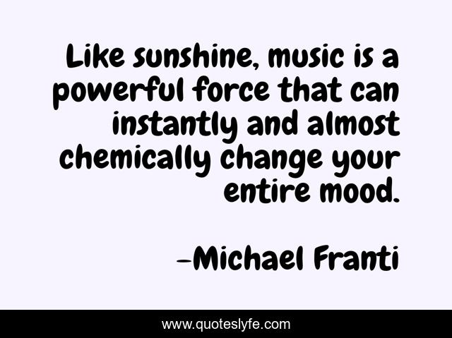 This page presents the quote "Like sunshine, music is a powerful force that can instantly and almost chemically change your entire mood.". Author of this quote is Michael Franti. This quote is about sunshine, powerful, change,.
